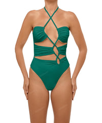 - Detail Feature: Asymmetric cut out one piece, Ruching detail, Adjustable criss cross halter neck