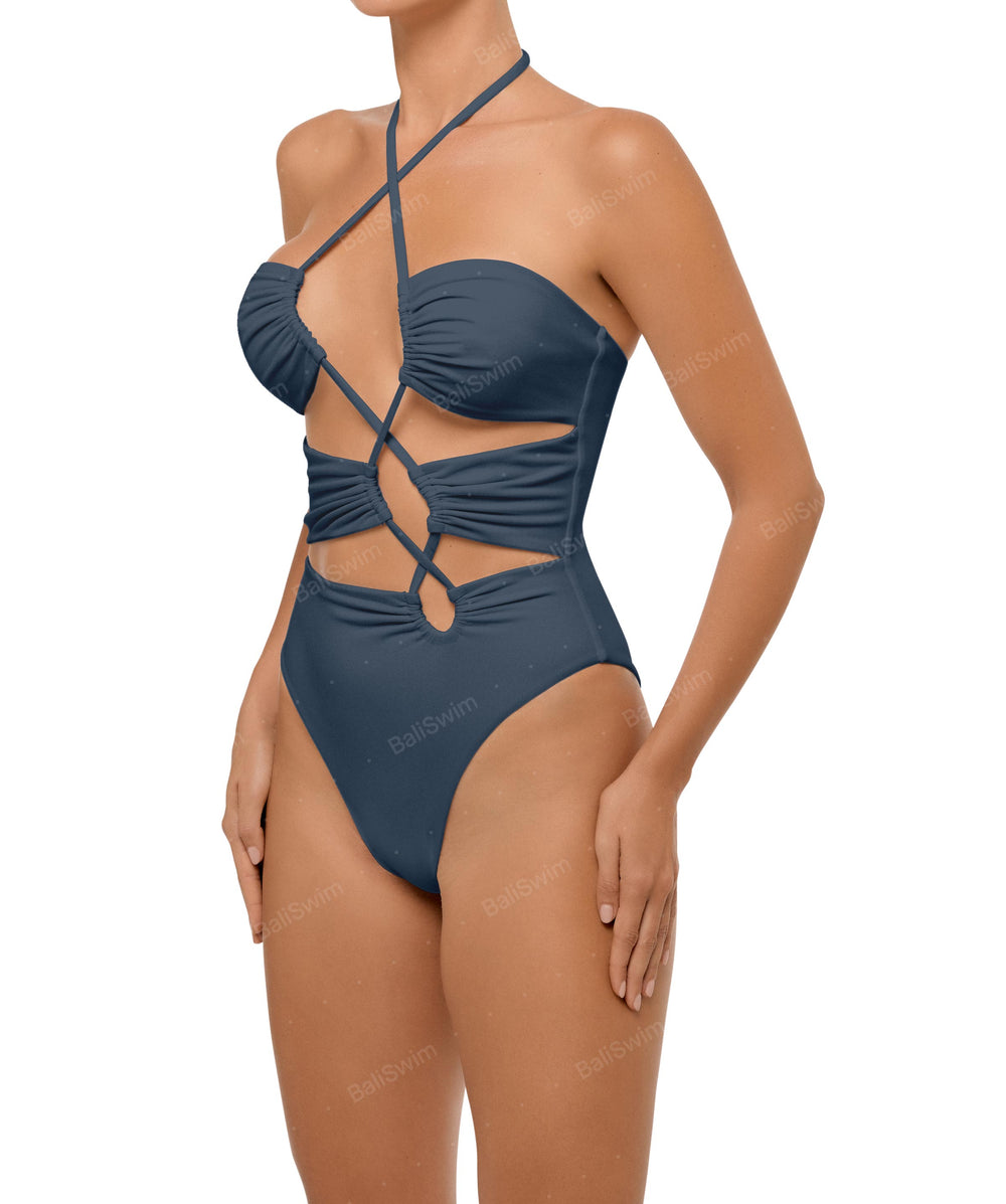 - Detail Feature: Asymmetric cut out one piece, Ruching detail, Adjustable criss cross halter neck