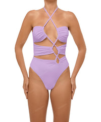 - Detail Feature: Asymmetric cut out one piece, Ruching detail, Adjustable criss cross halter neck