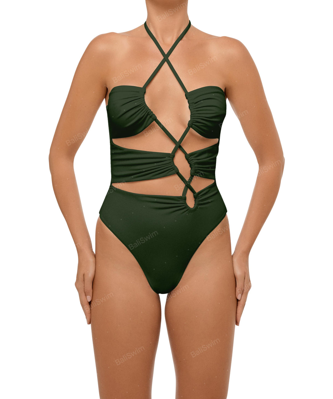 - Detail Feature: Asymmetric cut out one piece, Ruching detail, Adjustable criss cross halter neck