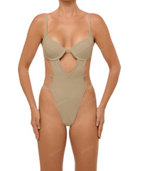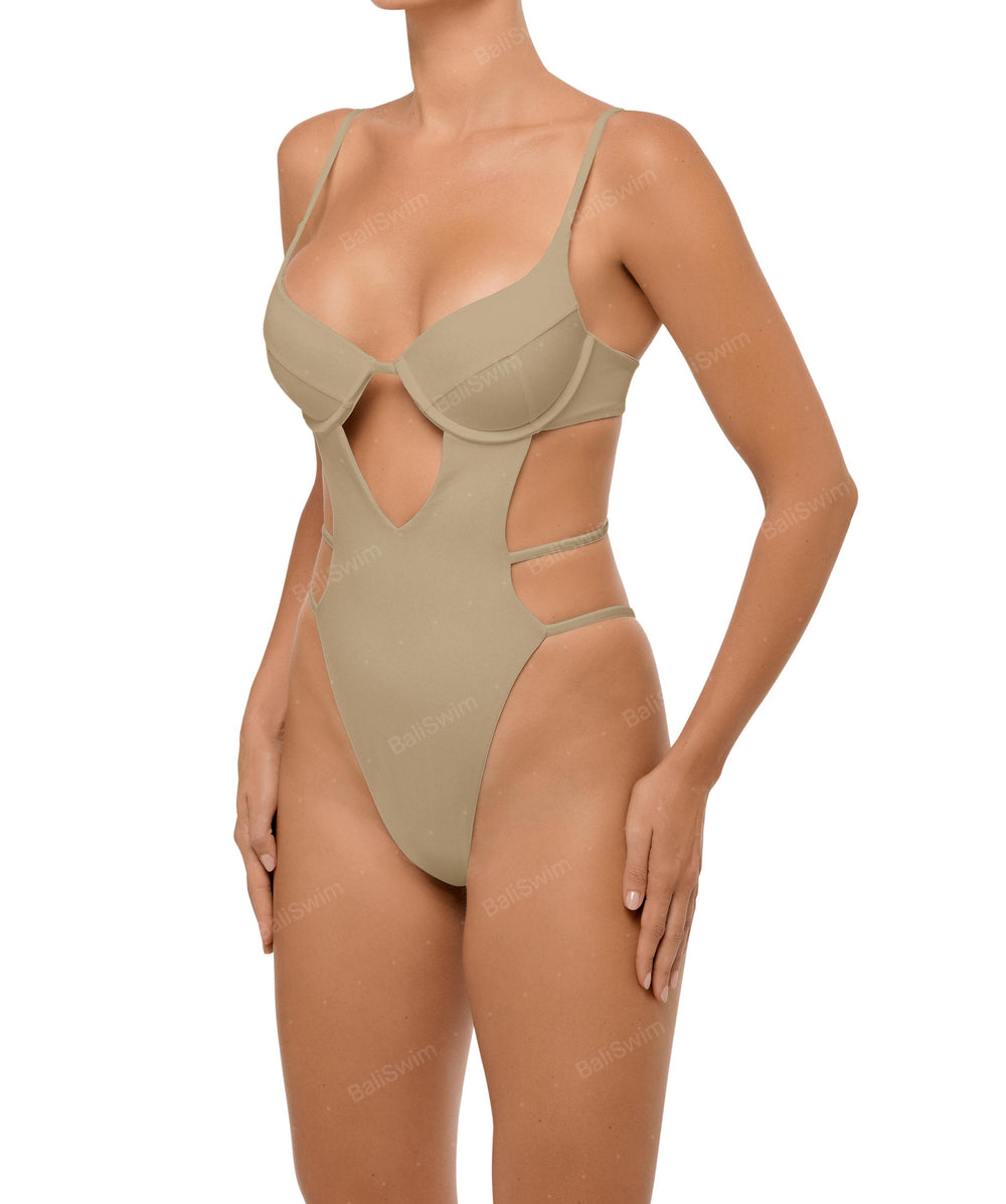- Detail Feature: V-underwired one piece, Cut out detail, Waist strap detail, Adjustable shoulder straps, High cut
