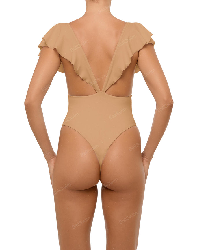 - Detail Feature: Flounce sleeves, Low V-neck, Low back, High cut