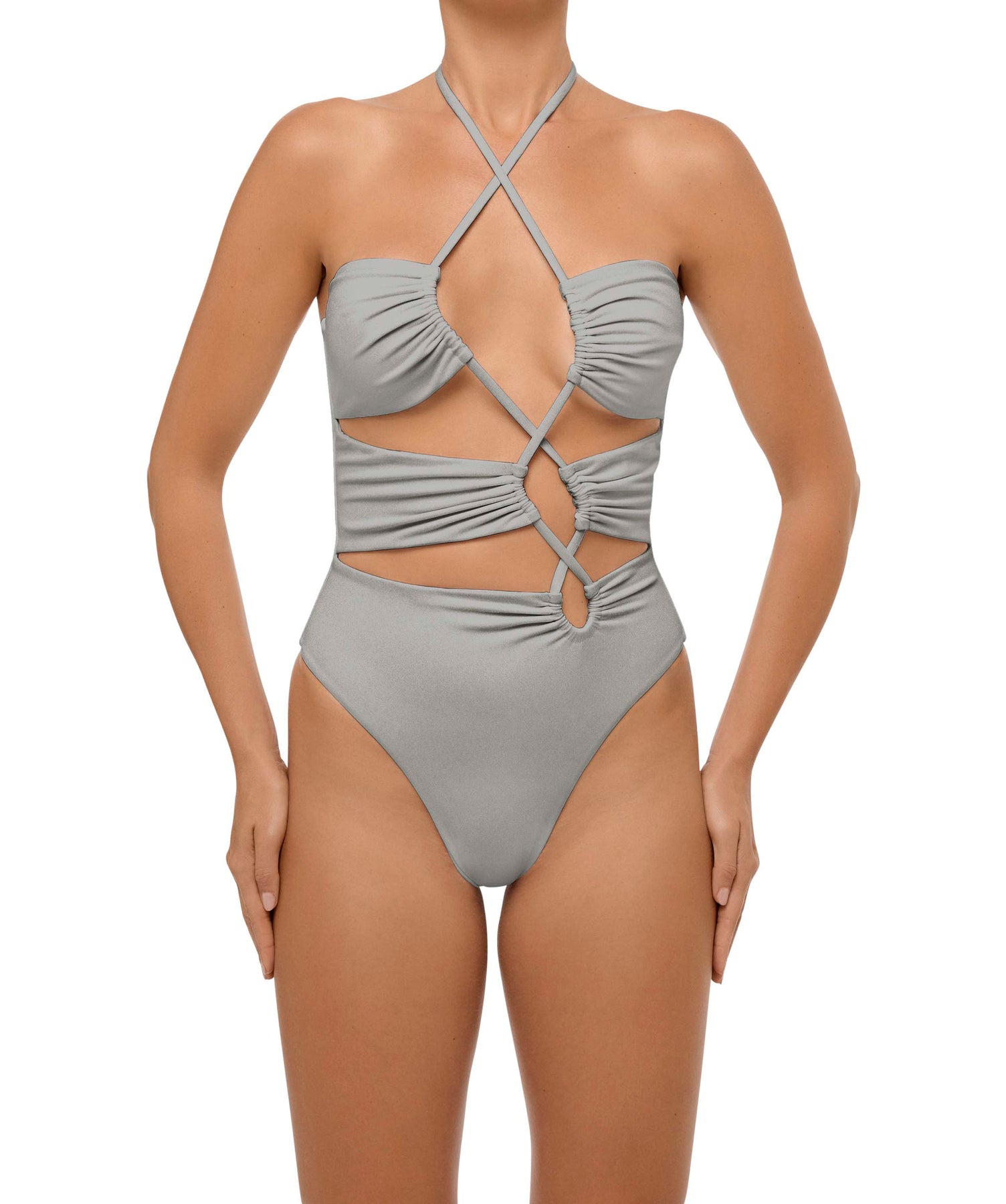 - Detail Feature: Asymmetric cut-out one-piece with ruching detail and an adjustable crisscross halter neck