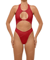 - Detail Feature: High-neck keyhole one-piece with cut-out details and a high-cut leg