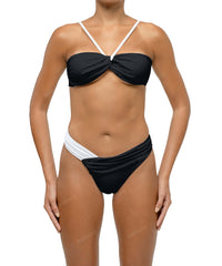 - Detail Feature: Halter bandeau bikini top, Front loop bandeau, Draped detail, Adjustable shoulder straps, Adjustable tie closure