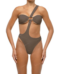 - Detail Feature: One shoulder detail, Wave ring detail, Front and back cut-out, High cut, Clasp closure