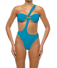 - Detail Feature: One shoulder detail, Wave ring detail, Front and back cut-out, High cut, Clasp closure