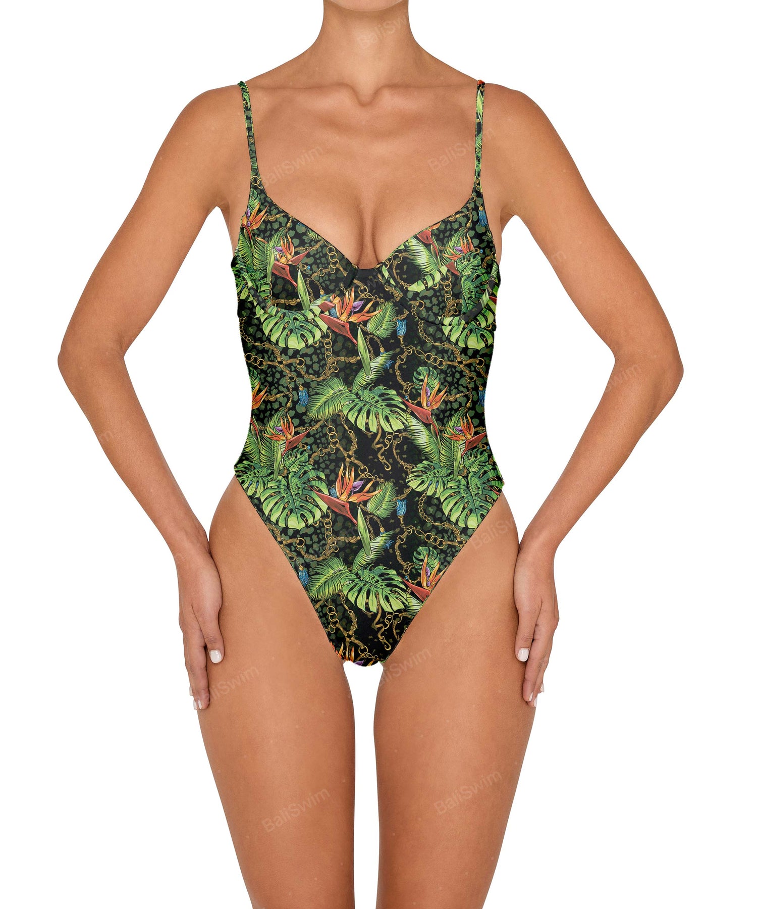 • Detail Feature: Classic underwire one piece with adjustable straps, high leg opening, back cut-out and back clasp