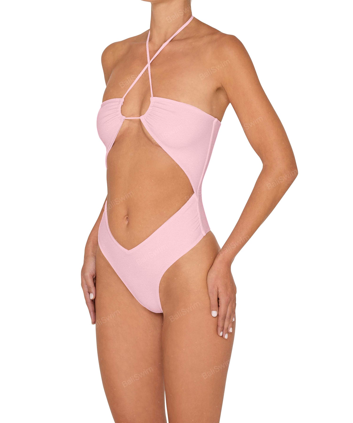 - Detail Feature: Halter tie neck one piece with center front cutout and V shape bottom, high cut leg opening, spaghetti straps. Multi-style as halter or bandeau