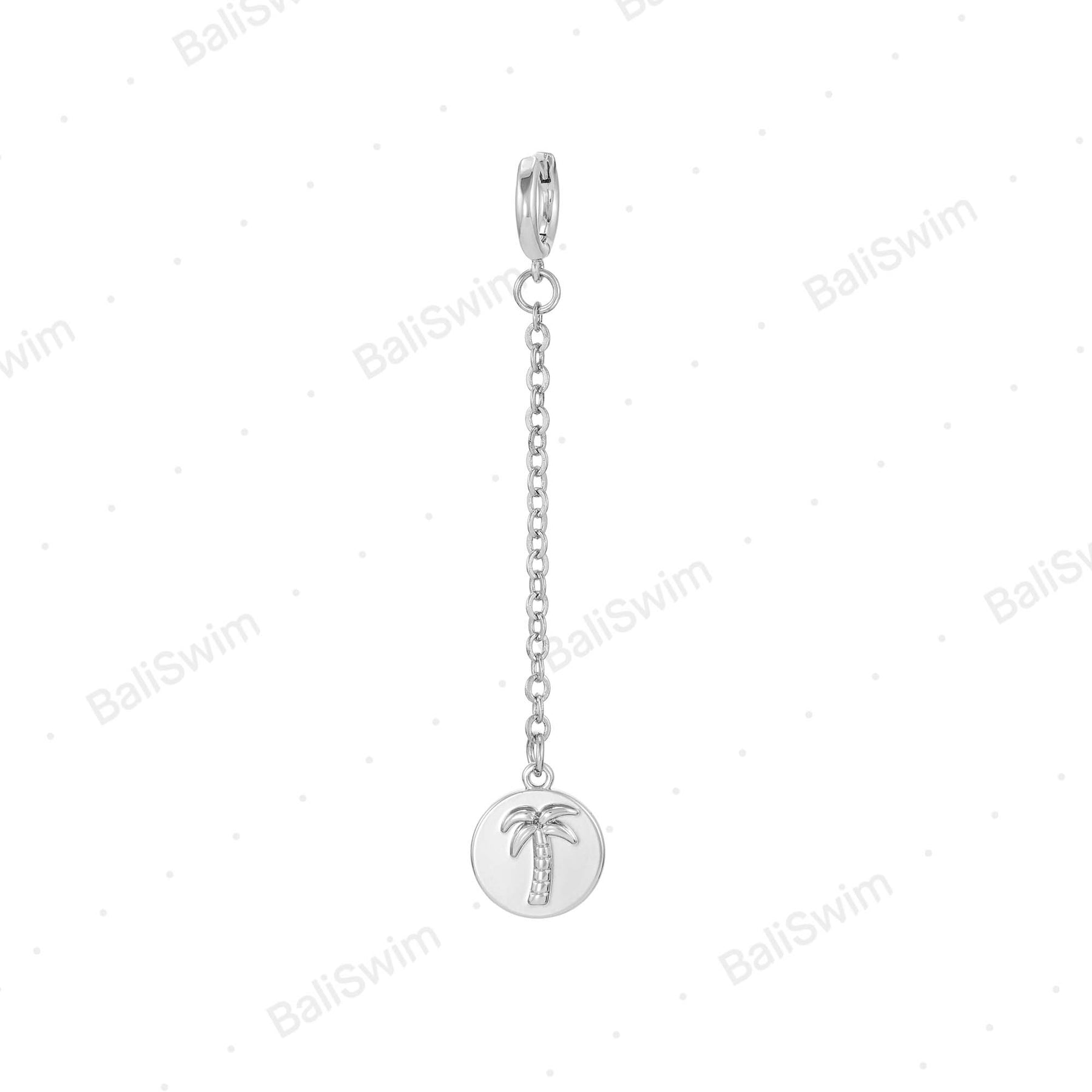 • Description: A delicate chain drop finished with a round charm featuring a palm tree detail. Finished with a small loop for easy application. The piece measures approximately 8 cm in length and 1.5 cm in width.