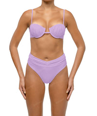 - Detail Feature: Front and back ruching detail, High rise, High cut, Brief style