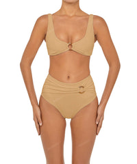 - Detail Feature: High rise bikini bottom, Waist overlay with O-Ring, Ruched detail