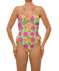 - Detail Feature: Versatile one piece, Adjustable halter ties, Front cutout, Side drawstring, High rise