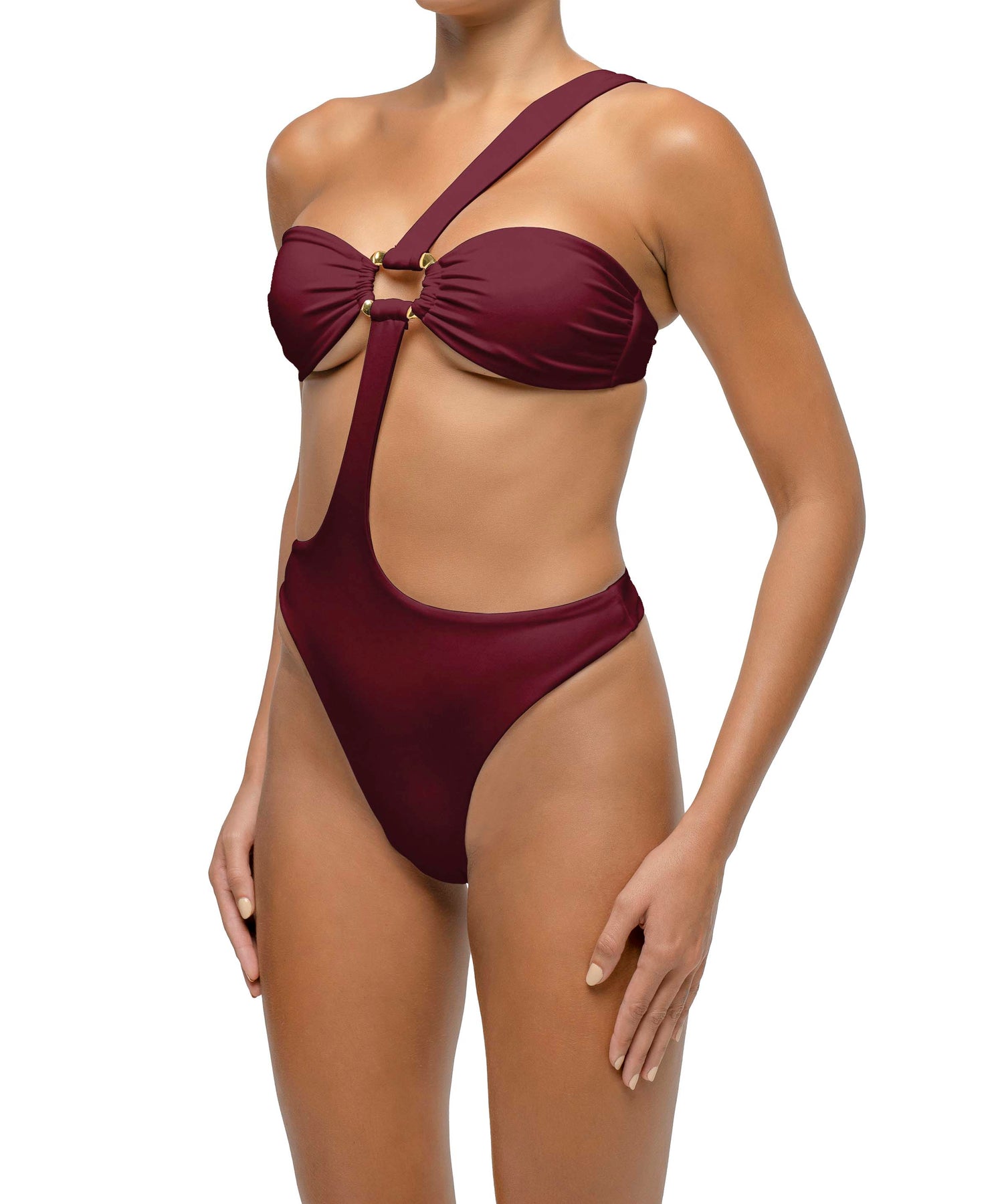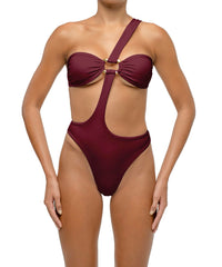 - Detail Feature: One-shoulder one-piece with wave ring detail, front and back cut-outs, clasp closure, and a high-cut leg