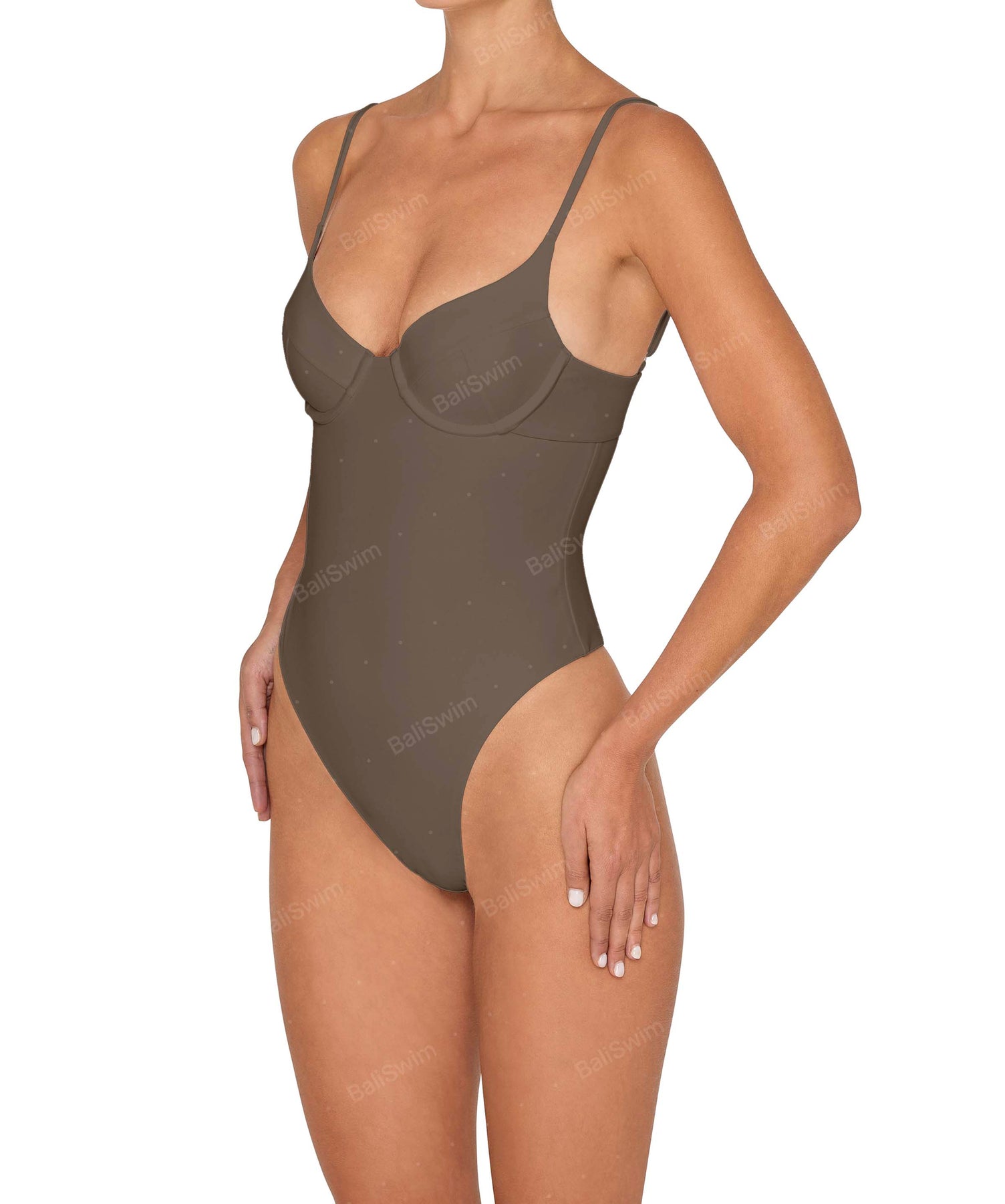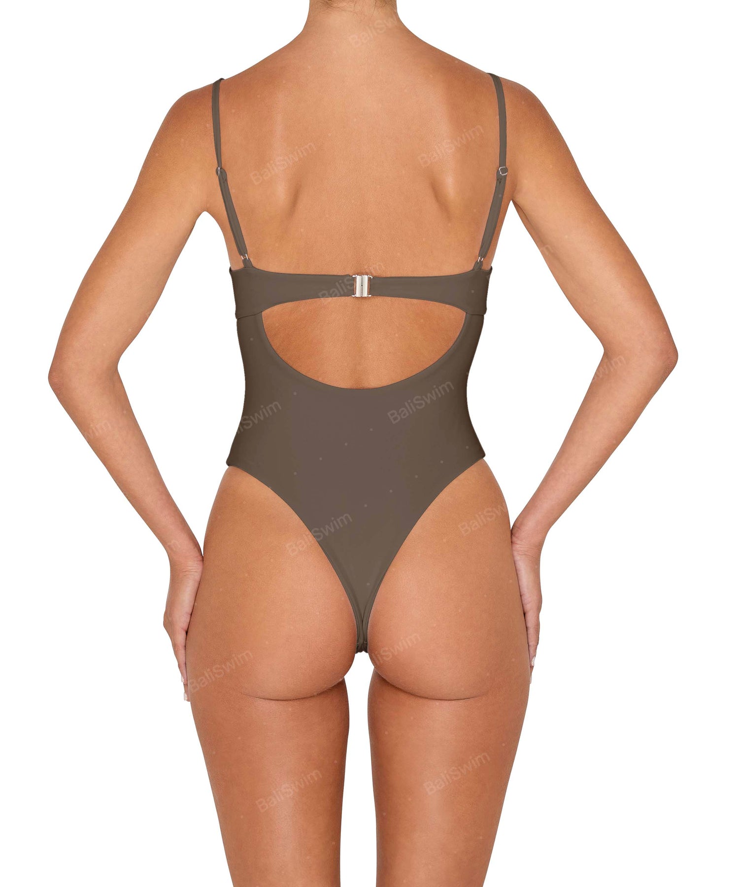 - Detail Feature: Classic underwire one piece with adjustable straps, high leg opening, back cut-out and back clasp