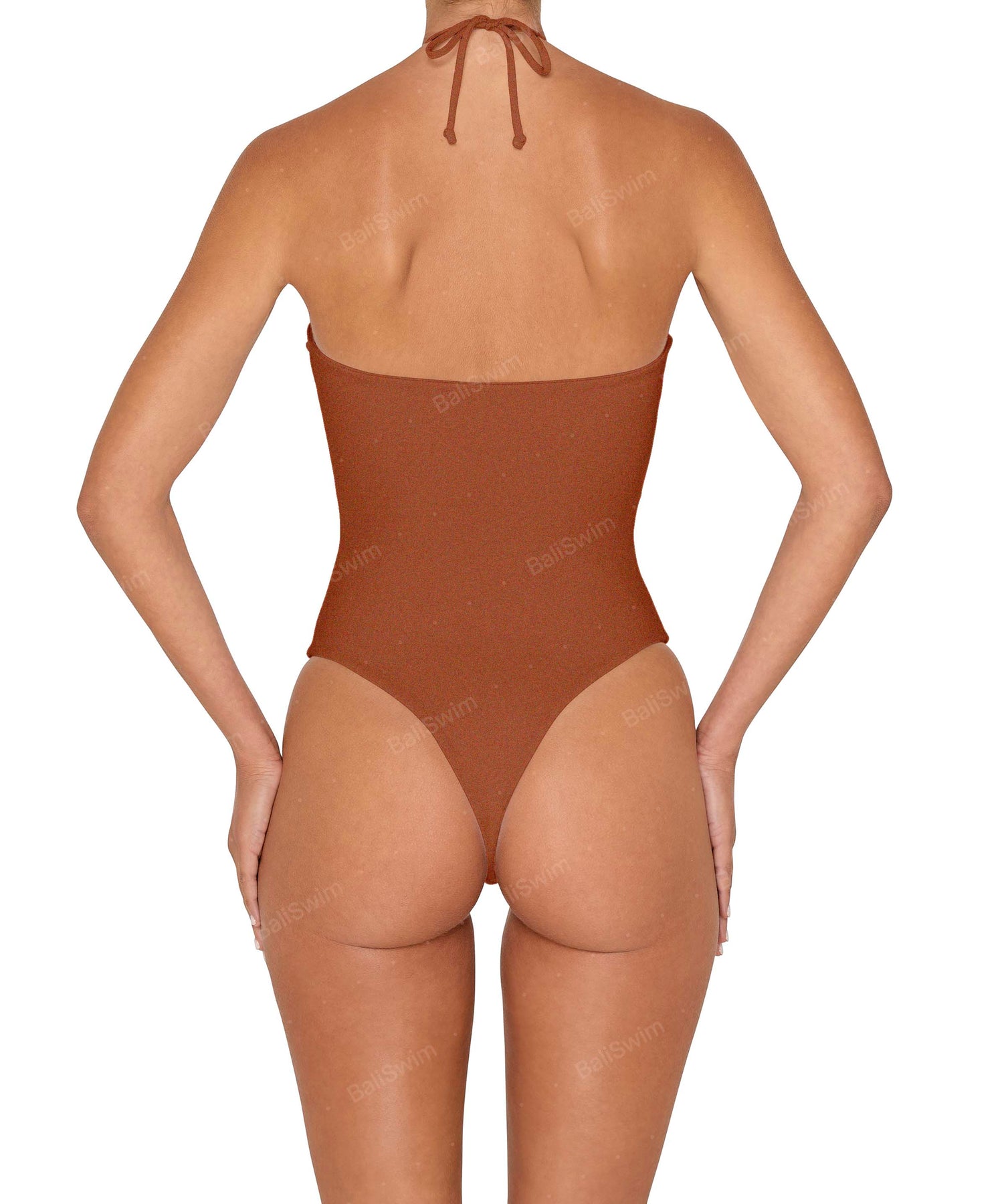 - Detail Feature: Halter tie neck one piece with center front cutout and V shape bottom, high cut leg opening, spaghetti straps. Multi-style as halter or bandeau