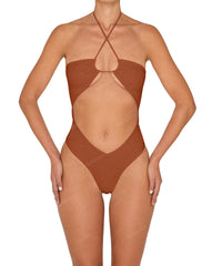 - Style: Halter Tie Neck One Piece With Center Front Cutout