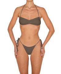 - Detail Feature: Halter bandeau top, center front ruching, with seamless finishing